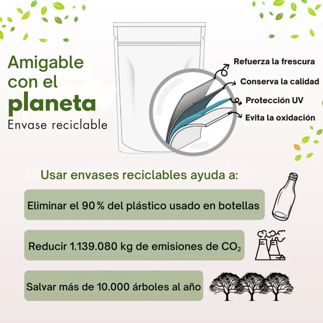 Creemos que cuidar tu cuerpo no debería generar impacto negativo. Por eso, usamos envases reciclables que conservan la frescura del producto y reducen el uso de plásticos en un 90 %, evitando la tala de miles de árboles y reduciendo emisiones de CO₂.